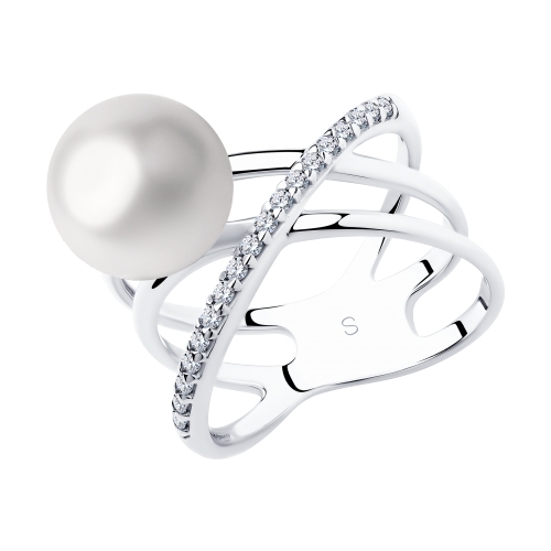 Кольцо из серебра с жемчугом синтетическим и фианитами