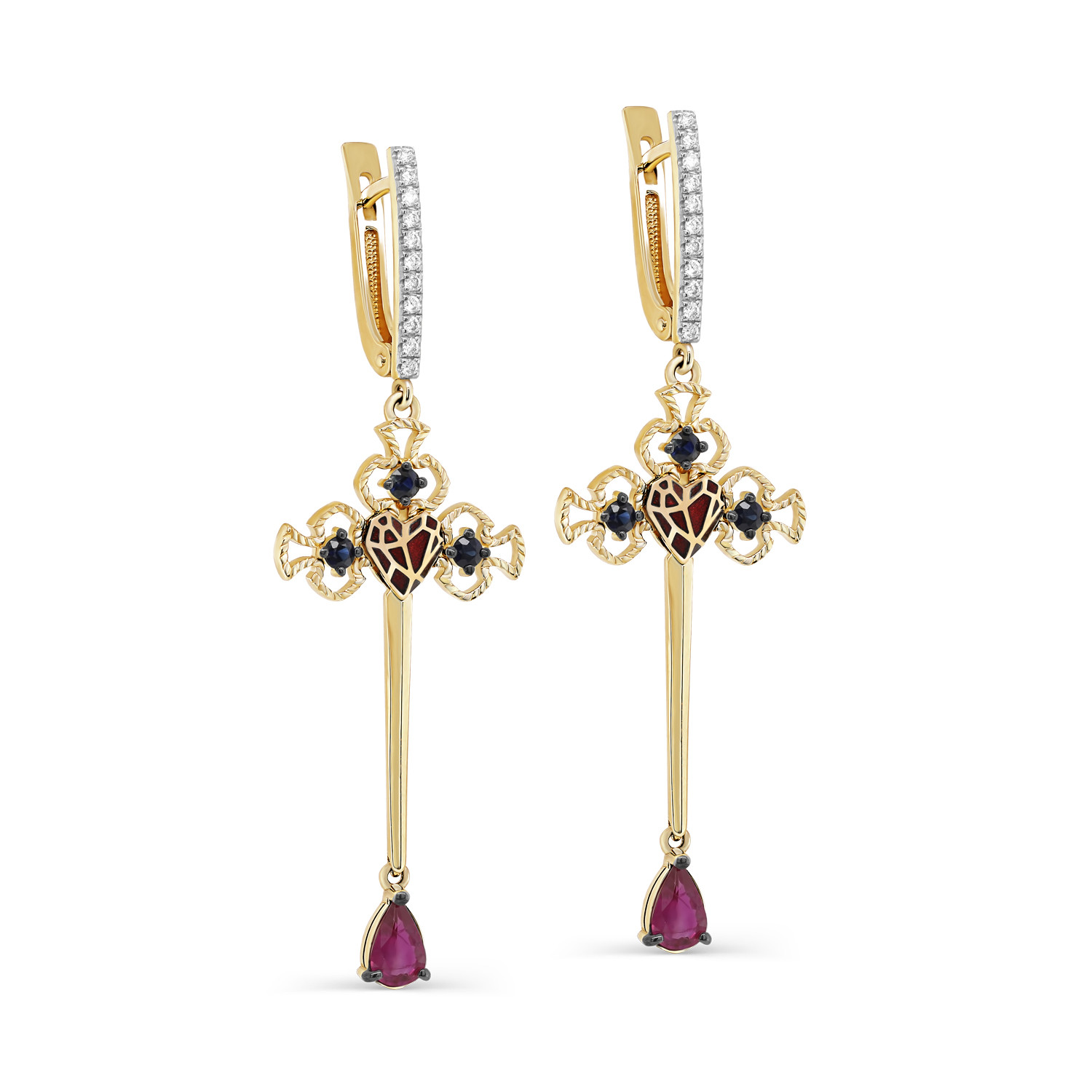 Серьги из жёлтого золота с бриллиантами,рубинами и сапфирами